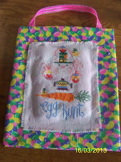 Since my partner didn't have a preference of Spring or Easter, I made two items, representing both Spring and Easter.  The picture above is Egg Hunt from Barbara Ana Designs, done on 16 ct pink aida.  I finish it off in a wall hanging but I think I put too much batting on.
